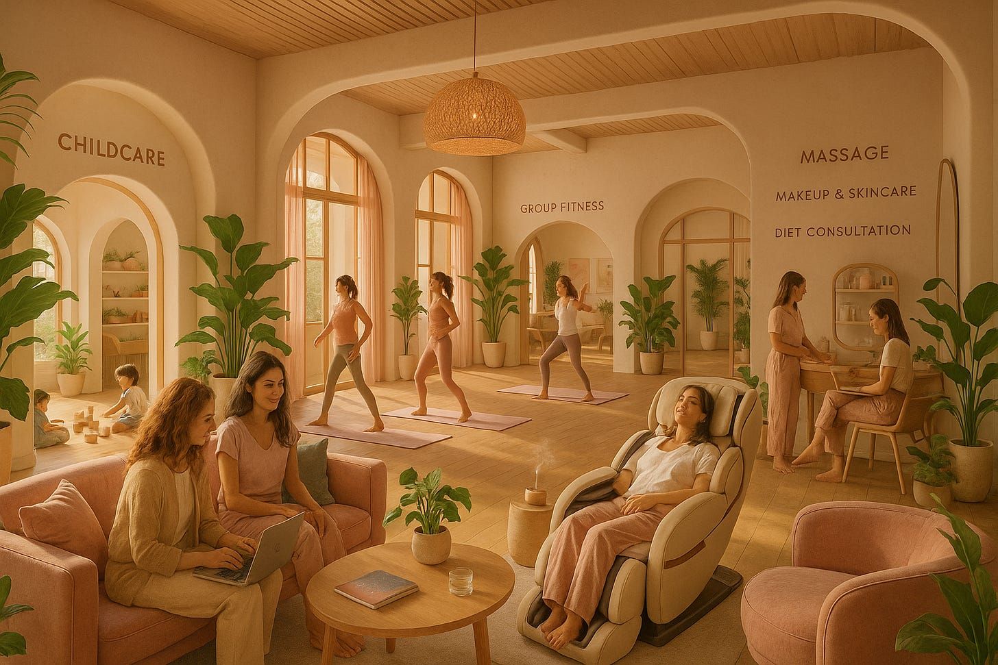 In our office, we offer in-house access to massage therapists, manicurists, pedicurists, hairstylists, personal trainers, yoga and breathwork instructors, skincare specialists, makeup artists, fashion stylists, and psychotherapists.